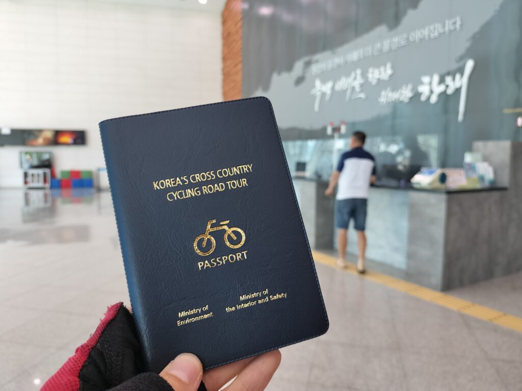 ただ走るだけだと飽きてしまいますが、韓国には「Cycling passport」というシステムがあります。 約20~30kmごとにイギリスの電話ボックスのような赤い「認証センター」が設置されており、そこでスタンプを押していくスタンプラリー形式になっています。