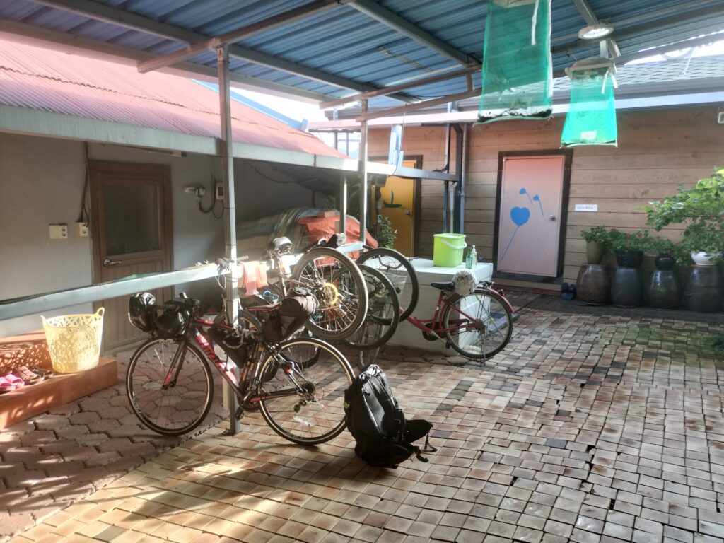 また、尚州ではサイクリスト向け民宿に飛び込みで泊まりました。Google mapの口コミが好評で、あらかじめ狙いを定めていた宿ですが、電話以外の予約手段がなさそうでドキドキしながら向かいました。電話が韓国語でできれば予約は取れそうです。日も傾きかけた17:00頃に着いたのですが、快く泊めてくれ、夕食も出していただけました。Nakdanbo bike houseというところです。