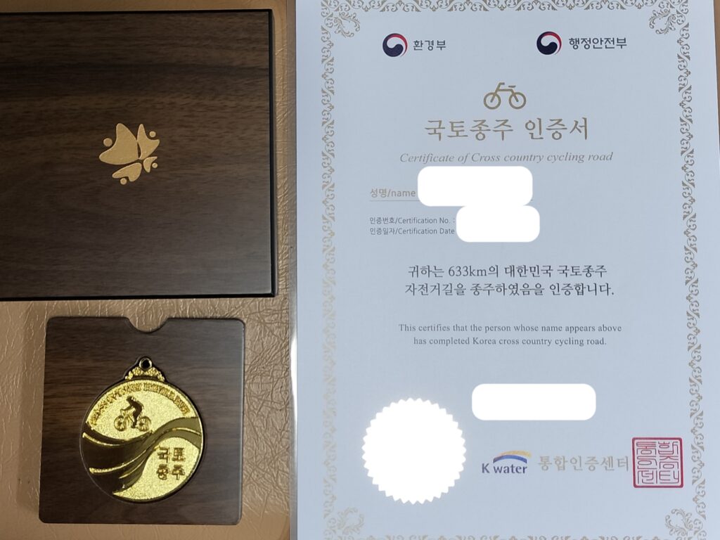 スタンプ帳は500円程度。全てのスタンプを集めて認定を受けると、認定証がもらえます。立派なメダルを買うこともできます。これはいいモチベーションになりました。ただ、認証センターはソウル・釜山とも市街地の中心からは離れているので要注意です(どちらも空港の近く)。釜山のセンターは月曜定休で、月曜までの休みを確保してからそれに気づいた私はもう1日休みを増やすことになりました。帰国日である火曜に、空港に自転車を預けてからバスで向かい、証明書とメダルをゲットしたのはここだけの話です。